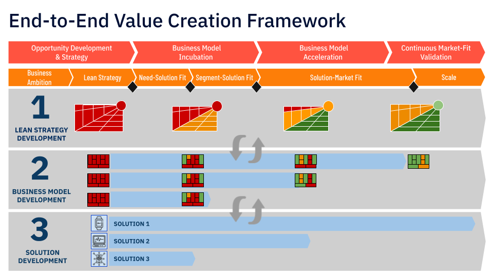 Business Model Incubator: A 4 week, timeboxed initiative where cross-functional teams were coached and mentored to design business models. Job-to-be-done based opportunity segments informed the design and prioritization of initial business models and solutions.